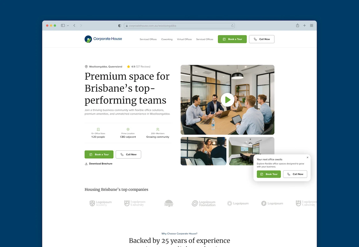 Corporate House is one of Queensland’s largest networks of serviced offices, coworking spaces, and virtual offices. With multiple locations across Brisbane and beyond, Corporate House needed a refreshed digital experience that better showcased its premium spaces and made it easier for prospective clients to explore, compare, and book tours.