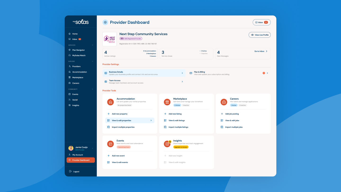 MySolas isn’t just a directory — it’s a complete ecosystem. We worked with the team to expand the platform into new service areas, including NDIS accommodation listings and product and item directories, making it a go-to resource for participants, support coordinators, and families alike.